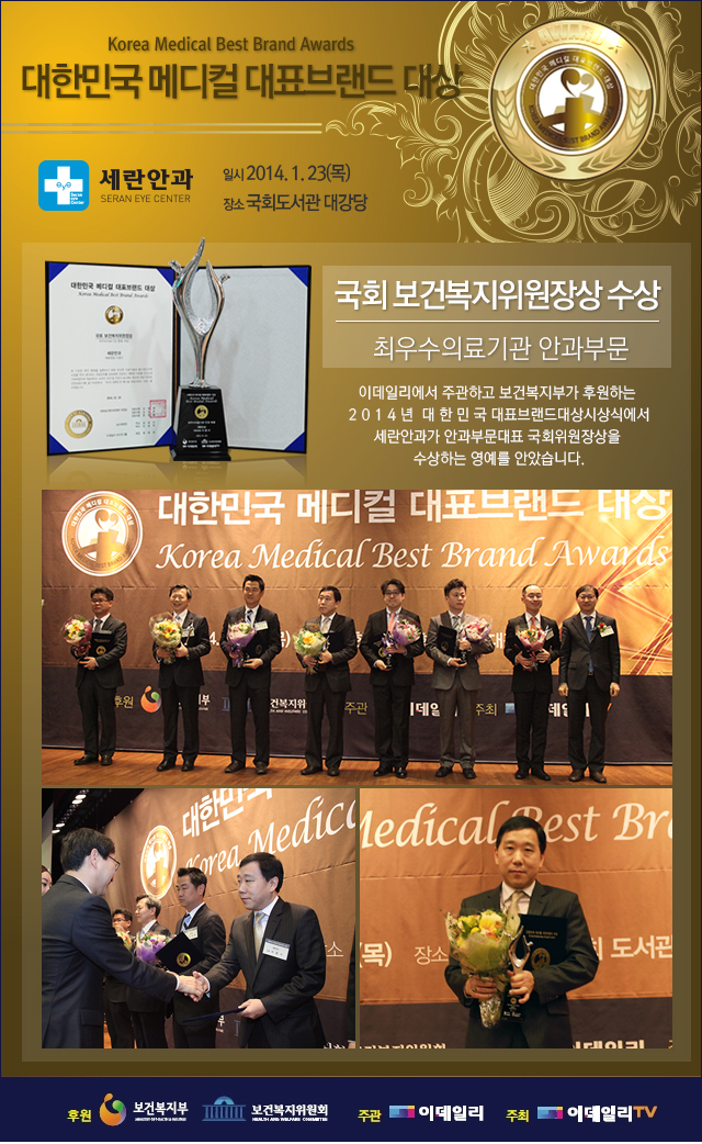제 목 2014 대한민국 대표브랜드 대상수상 등록일 2014-01-23 2014년 대한민국 메디컬 대표브랜드 대상 안과부문 국회보건복지위원장상 수상 ------------------------------------------------------------------------ 2014년 1월 23일(목) 국회도서관에서 개최된 2014년 대한민국 메디컬 대표브랜드 대상에서 세란안과가 안과부문 국회보건복지위원장을 수상하였습니다. 앞으로도 안과발전을 위하여 최선의 노력을 다하겠습니다. 감사합니다. 이 전 다 음 목 록