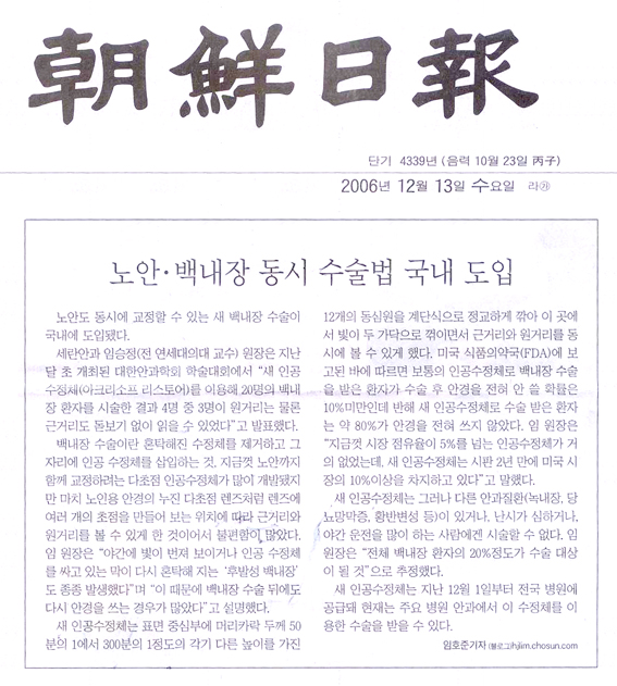 ![]() 2006년 12월 13일 조선일보에 임승정원장님께서 새롭게 국내에 도입하신 새 백내장수술법이 소개되었습니다.새롭게 도입된 백내장수술법은 백내장 수술과 동시에 노안까지 치료할 수 있는 최신 수술법으로 미국에서 그 결과를 인정받은 아크리소프 리스토어 렌즈를 사용하는 새로운 수술법입니다. 저희 세란안과에서 20명의 백내장 환자를 대상으로 시술한 결과 4명 중 3명이 원거리는 물론 돋보기 없이 신문을 읽을 수 있을 정도의 근거리 시력을 회복되었습니다.아크리소프트 리스토어 렌즈에 대해서 자세한 기사내용을 원하시는 분께서는 아래의 기사전문을 참고하시기 바랍니다.고객여러분을 위하여 언제나 앞서가는 세란안과가 되기 위하여 최선의 노력을 다하겠습니다.감사합니다. 기사보러가기 |