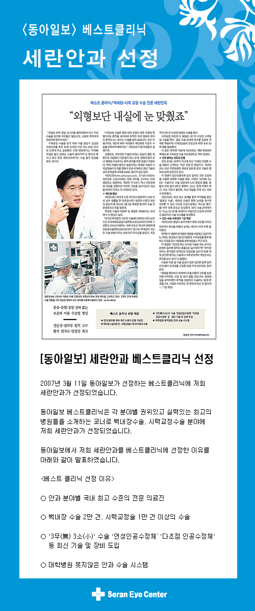 [동아일보] 베스트 클리닉 - 세란안과 선정 - 병원소식