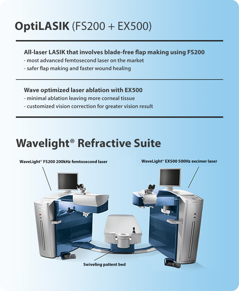 Blade free OPTiLASIK is a computer-controlled procedure that combines flap making with FS200 femtosecond laser and reshaping of cornea to correct vision errors with EX500 excimer laser.